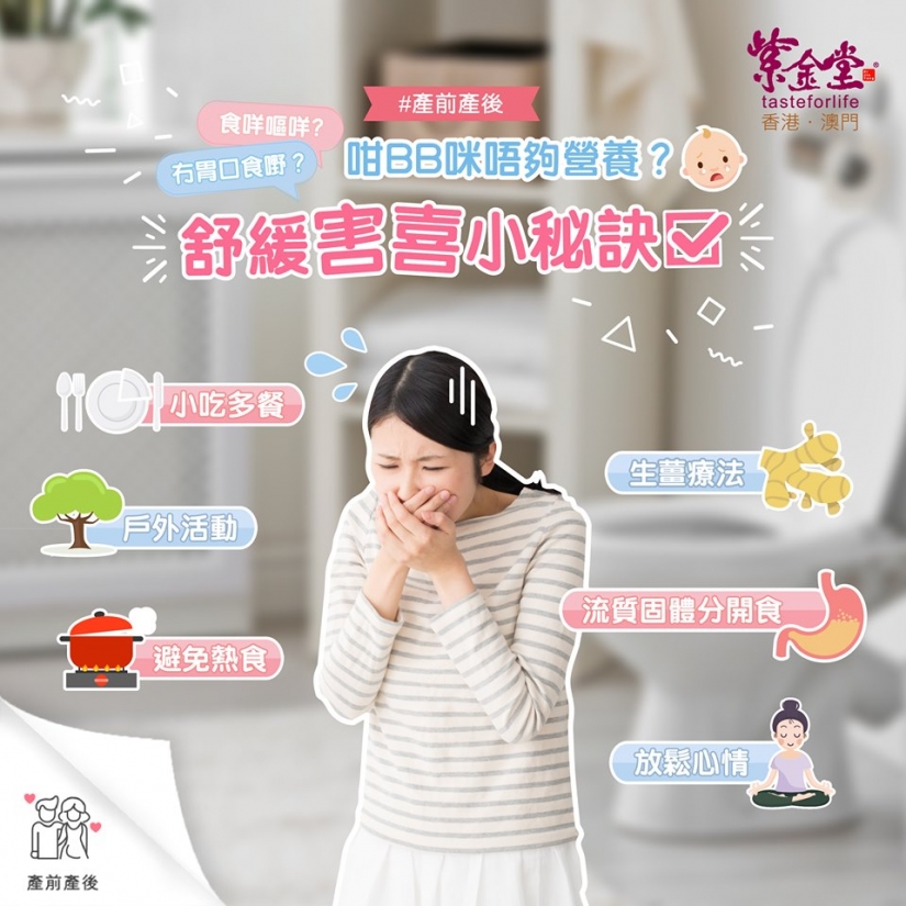 「食少少嘢就嘔,就嚟連黃膽水都嘔埋出嚟啦!」相信好多媽媽喺懷孕初期都會有害喜嘅現象,唔單止食咩嘔咩,仲要冇胃口食嘢,搞到媽媽攰得嚟仲要擔心BB嘅營養問題!等紫金堂講幾個小秘訣,幫妳安神同埋養血養胎!