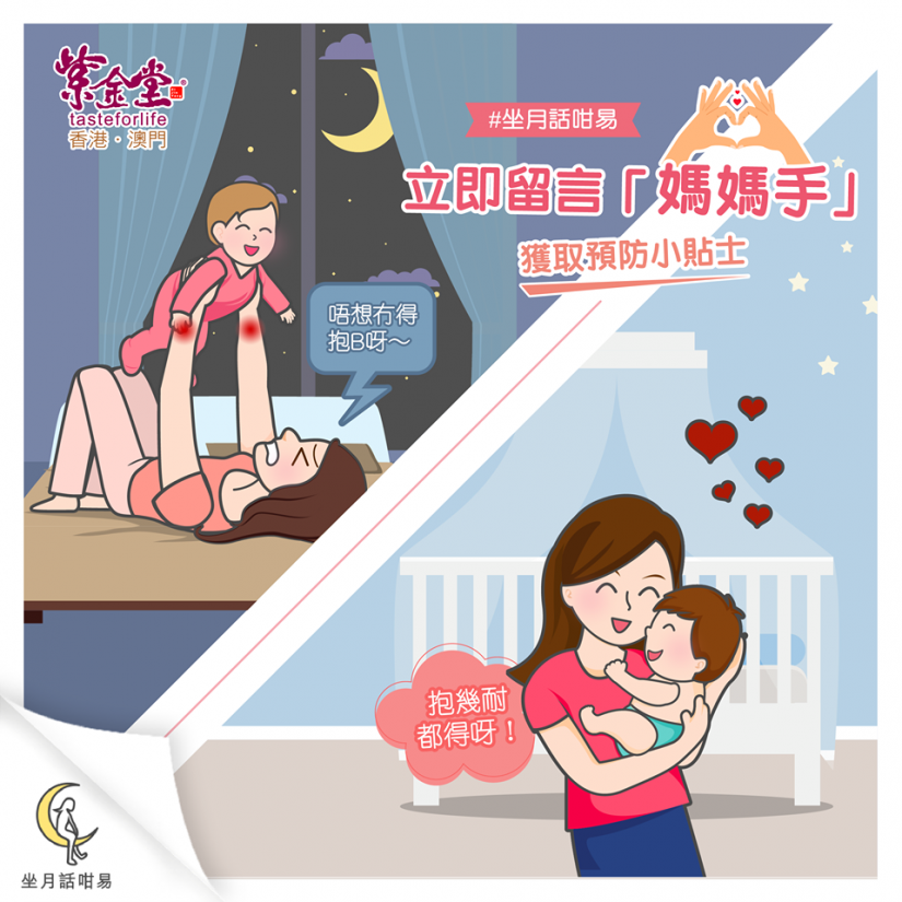 媽媽要避免用比較細嘅關節同肌肉去做長時間、經常重複嘅動作,亦可以試下左右手交替咁抱,又或者每隔一段時間,放自己一個break,比手指、手腕同埋手臂去抖抖。