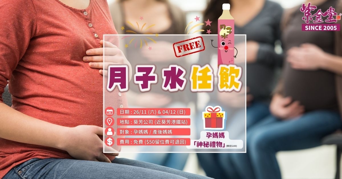 各位準媽媽,快D約埋媽媽GROUP的朋友,一齊來試飲「月子水」,現場仲有產後顧問為您提供免費產後坐月資訊。仲有產後母乳媽媽,可以邊飲「月子水」,邊同其他母乳媽媽交流產後哺乳經驗。