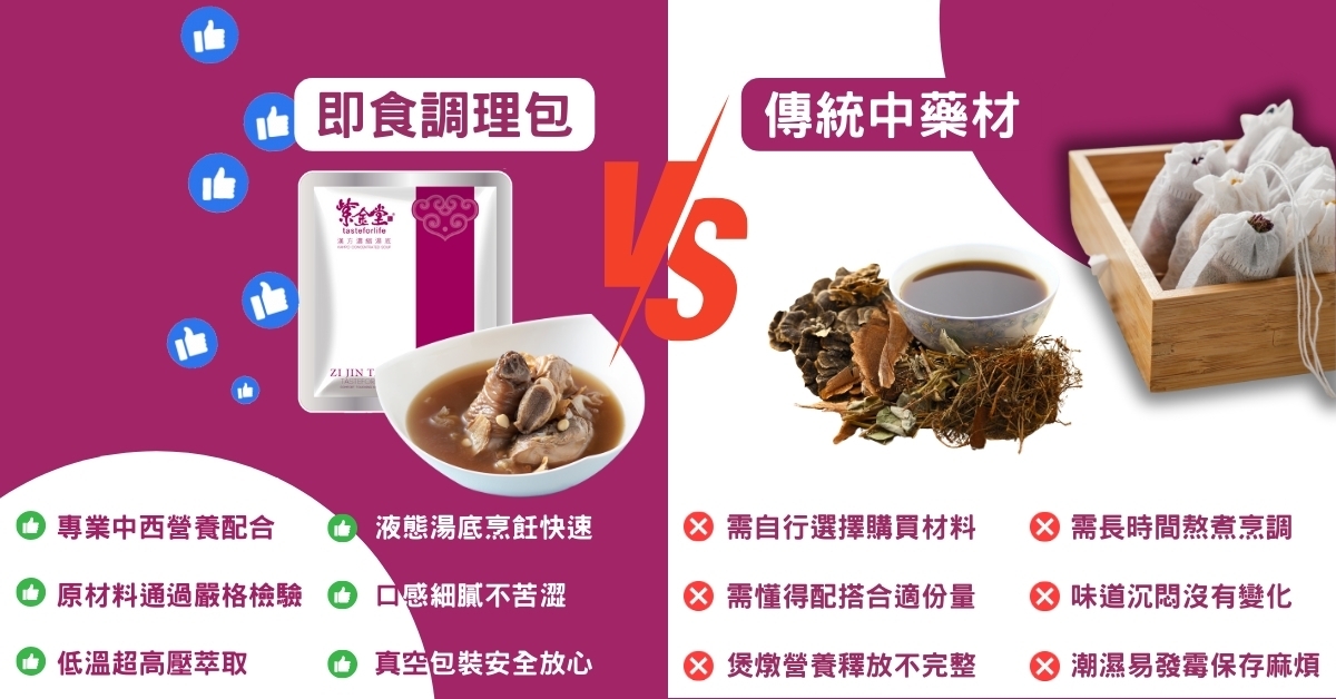 紫金堂即食功能性調理包承繼了傳統中醫的藥食同源,亦改良了過去繁複的工序。